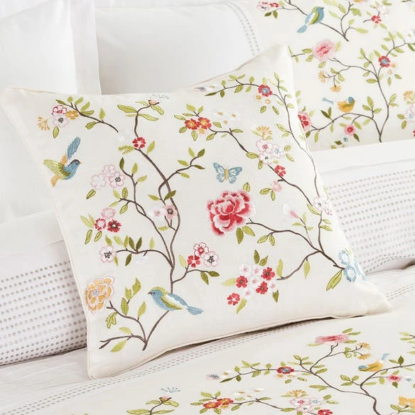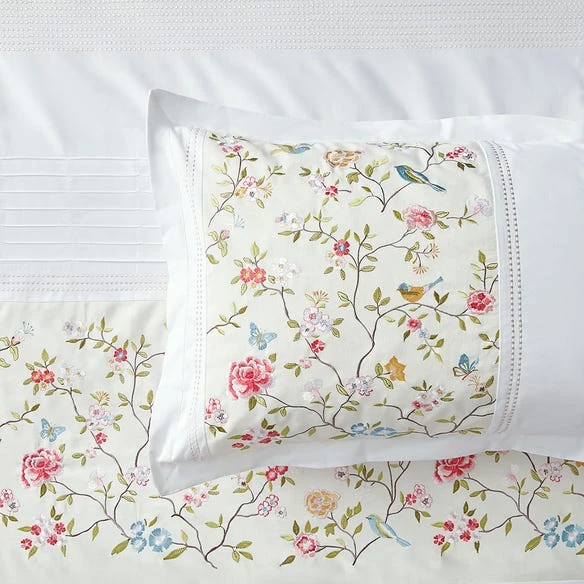 Blossoms, birds and butterflies are complemented by rows of subtle embroidery and pintuck detailing to create this stunning quilt cover.