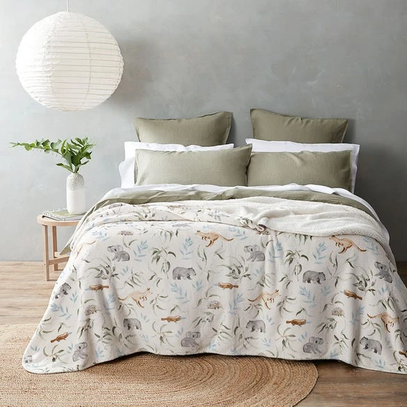 Snuggly and soft, the Otway Sherpa Blanket is the perfect choice for the cooler months. Printed on plush polyester with a sherpa reverse, this blanket features adorable Australian animals and native foliage over a soft ivory base.